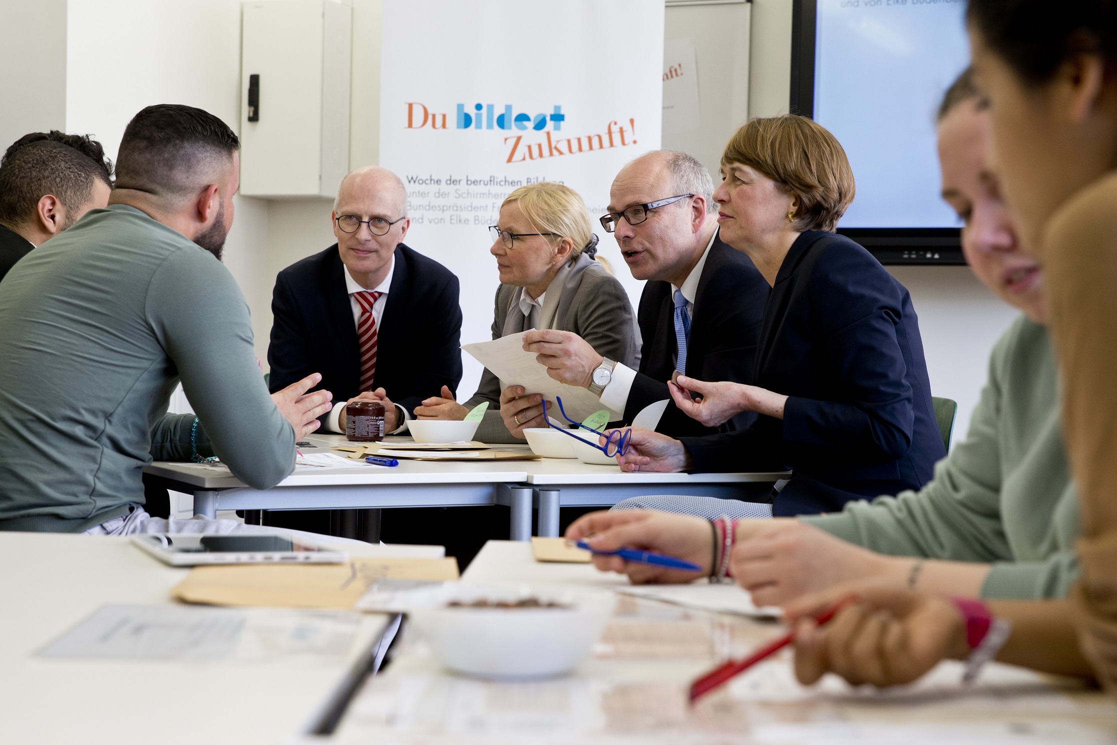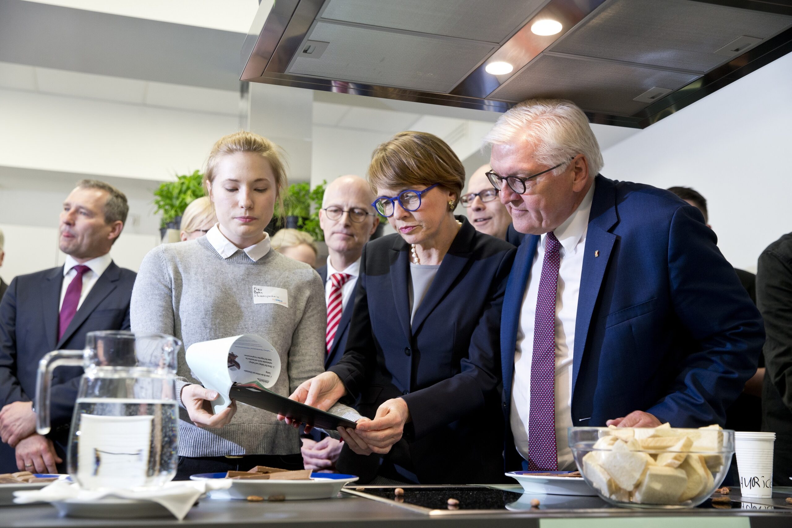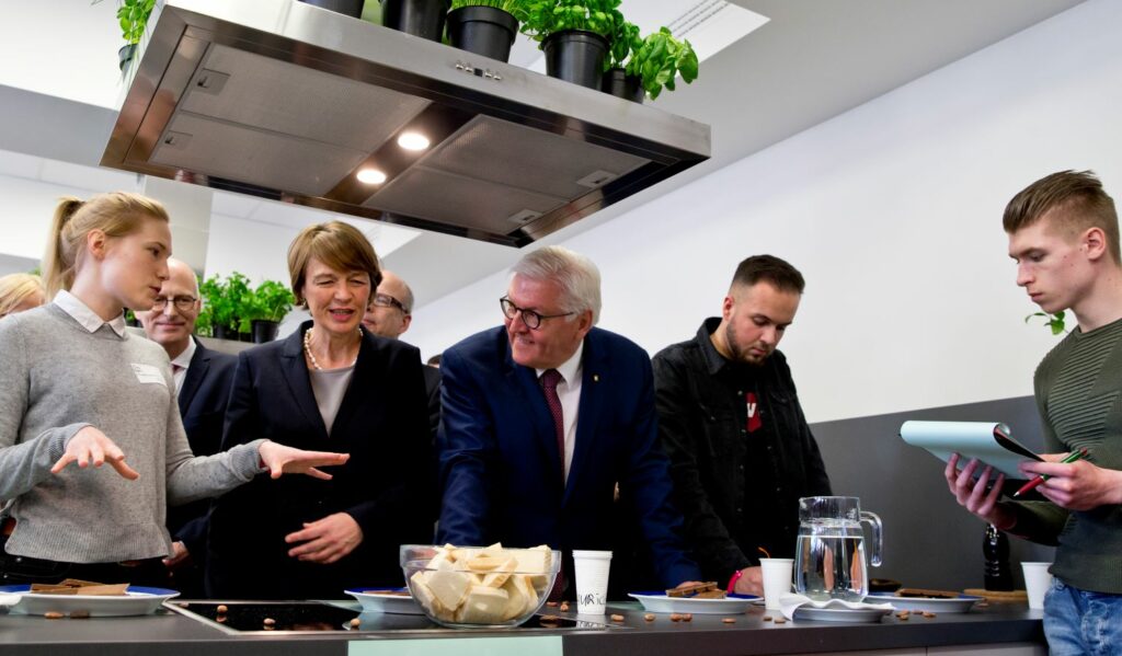 In der Beruflichen Schule Anckelmannstraße (BS 01) und der Beruflichen Schule für Wirtschaft und Handel Hamburg-Mitte (BS 02) informierten sich der Bundespräsident und Elke Büdenbender gemeinsam mit Hamburgs Erstem Bürgermeister Peter Tschentscher sowie Bildungssenator Ties Rabe über digitales Lernen sowie über die Kooperationen zwischen Schulen und Wirtschaft. Sie besuchten angehende Einzelhandelskaufleute im Unterricht, ließen sich von den Gestalterinnen und Gestaltern für visuelles Marketing durch eine selbst gebaute Schaufenstermeile führen und kamen mit Unternehmensvertretern aus dem Einzelhandel ins Gespräch.